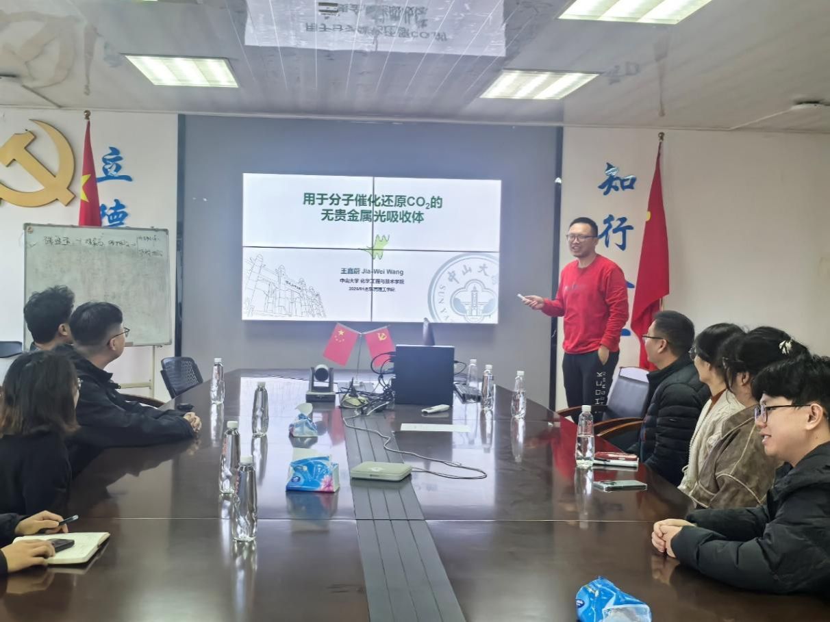 报告中,王嘉蔚副教授围绕“太阳能—化学能”转化与CO₂资源化利用的关键问题展开,结合光催化还原CO₂体系中光敏单元的作用机理,阐释了光吸收体在吸收光能后产生激发态并驱动电子转移的基本过程。他重点讨论了无贵金属光吸收体在光催化体系的优势与设计思路,强调通过优化分子间电子传输速率、构建“动态相互作用”光致电荷转移路径,有望进一步推动高效CO₂转化技术的发展。