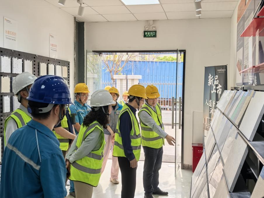 在公司副总经理郭栋的带领下,韩国a片拓岗小组参观了企业的成品样版展示窗和企业生产车间。期间,郭经理介绍了不同材质和尺寸的人造石板的制作方法与工艺流程,以及常规的市场应用场景,并指出人造石材环保安全、性能稳定、设计自由等核心优势。